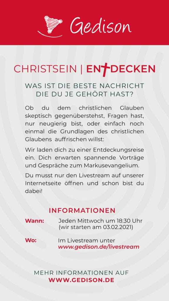 Vom 4. März bis zum 9. März wollen wir als Gemeinde eine Gebetswoche miteinander verbringen. In kleineren Gruppen wollen wir dies sogar live gemeinsam erleben.