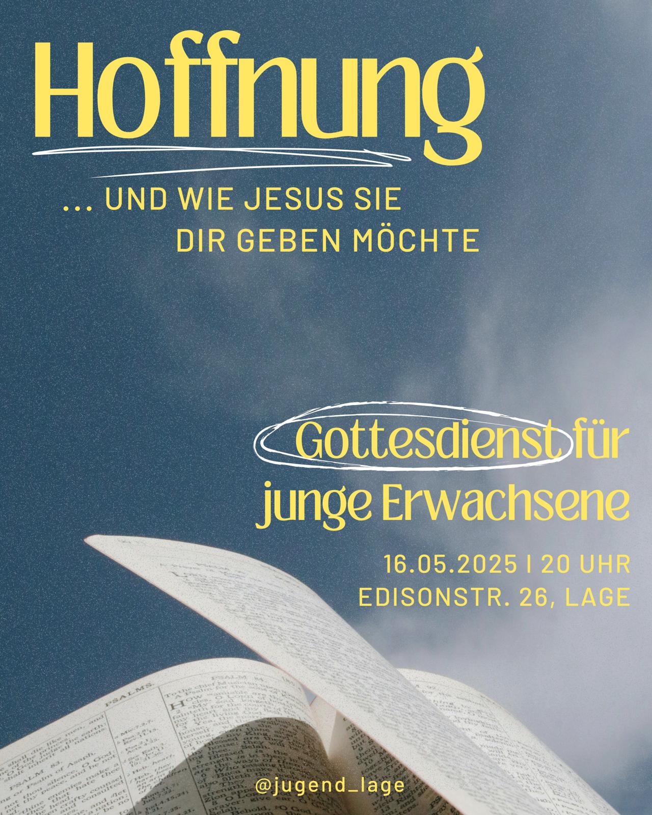 Alle jungen Erwachsenen sind herzlich zu unserem Gottesdienst mit dem Thema „Hoffnung und wie Jesus sie dir geben möchte“ eingeladen.